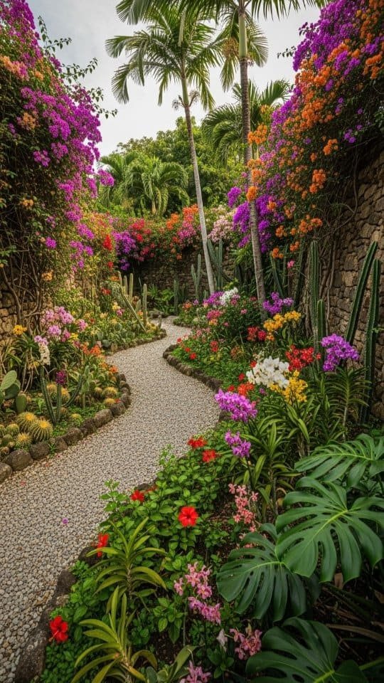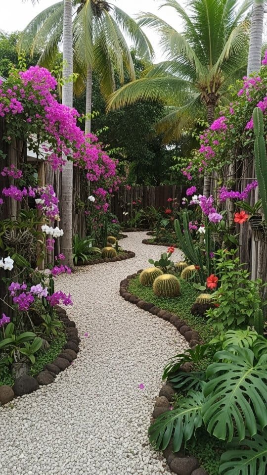 Pebble paths feel natural in a tropical garden. I like how gravel helps rainwater drain fast, keeping plants happy. Cactus and palms add height while orchids bring soft colors.