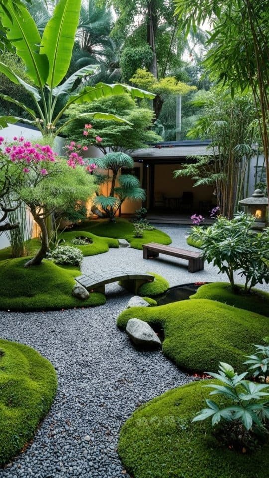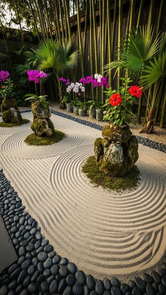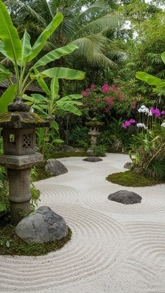 Raked sand can mimic flowing water and bring a peaceful feel to any tropical garden. I love pairing it with stone lanterns for that timeless Japanese charm.