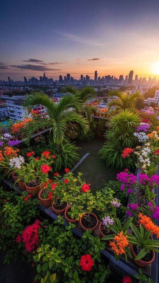 My rooftop garden feels like a tropical paradise. Orchids fill lightweight containers and bloom in every corner, spilling vibrant colors across the space.