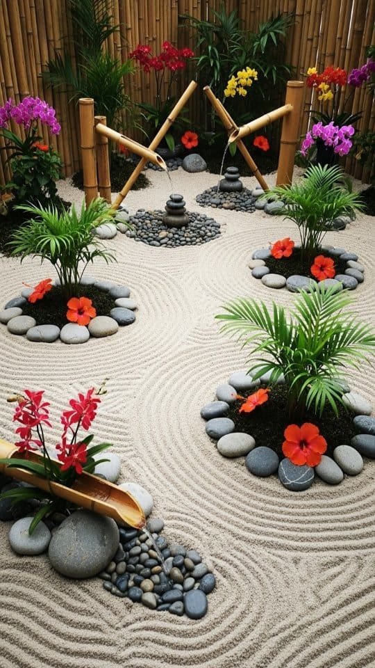 I use soft sand to create patterns by hand or with a rake. Stones add balance, while bright orchids bring life to the space. This garden feels simple yet full of beauty.